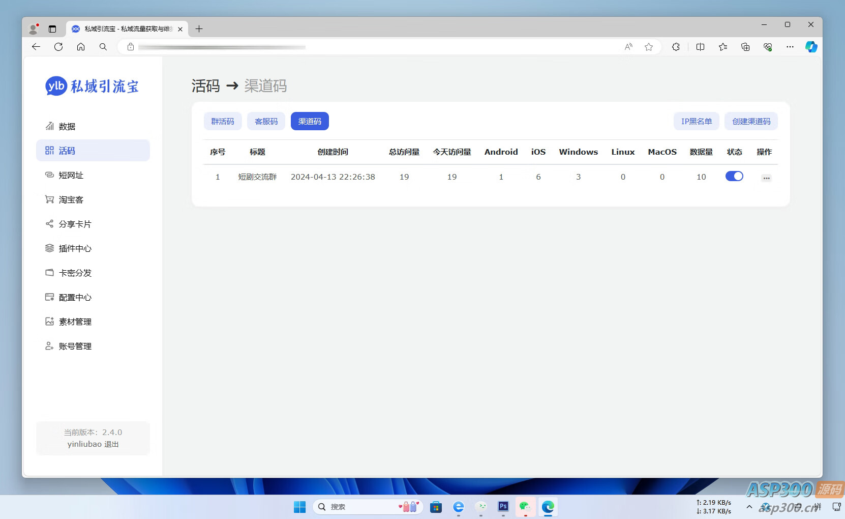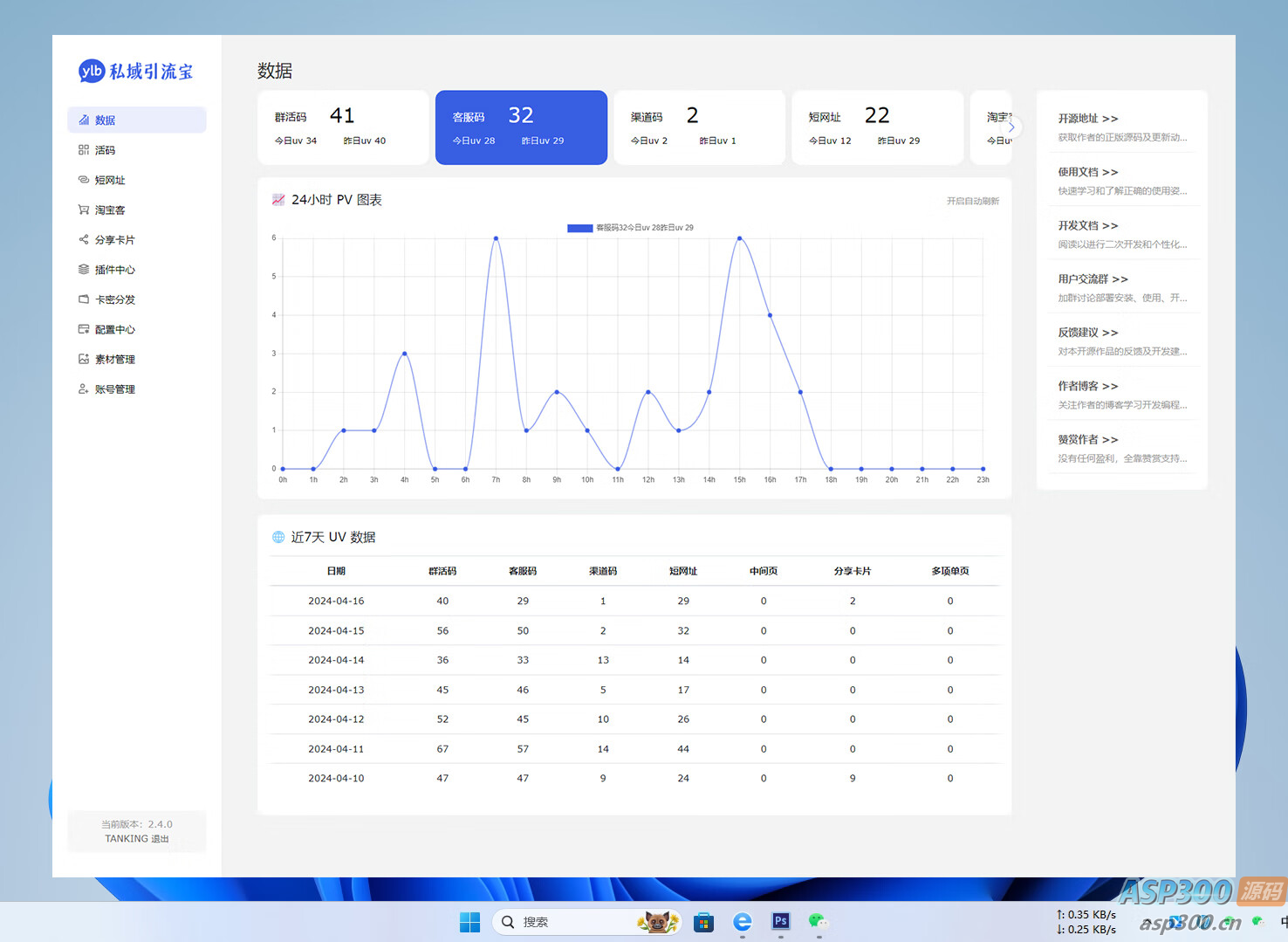 群活码、客服码、渠道码、短网址、淘宝客中问页、多项单页、分享卡片当天总访问量统计、各时段访问量统计,今天IP和昨日IP统计、近7天IP数据展示。