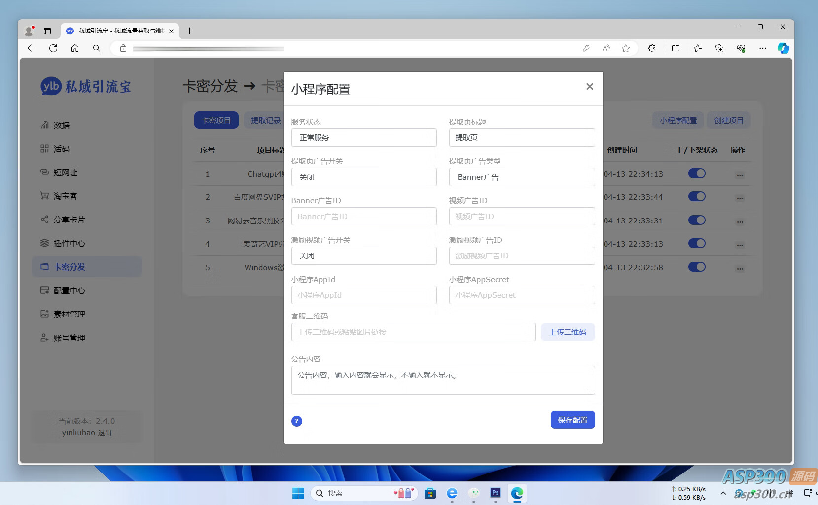 创建、编辑、删除卡密项目;批量导入卡密,配置卡密提取小程序的广告ID、激励视频广告、视频广告、banner广告,设置需要看完广告才可提取卡密,设置提取时间间隔,不允许重复提取,禁止指定0penid提取等。
