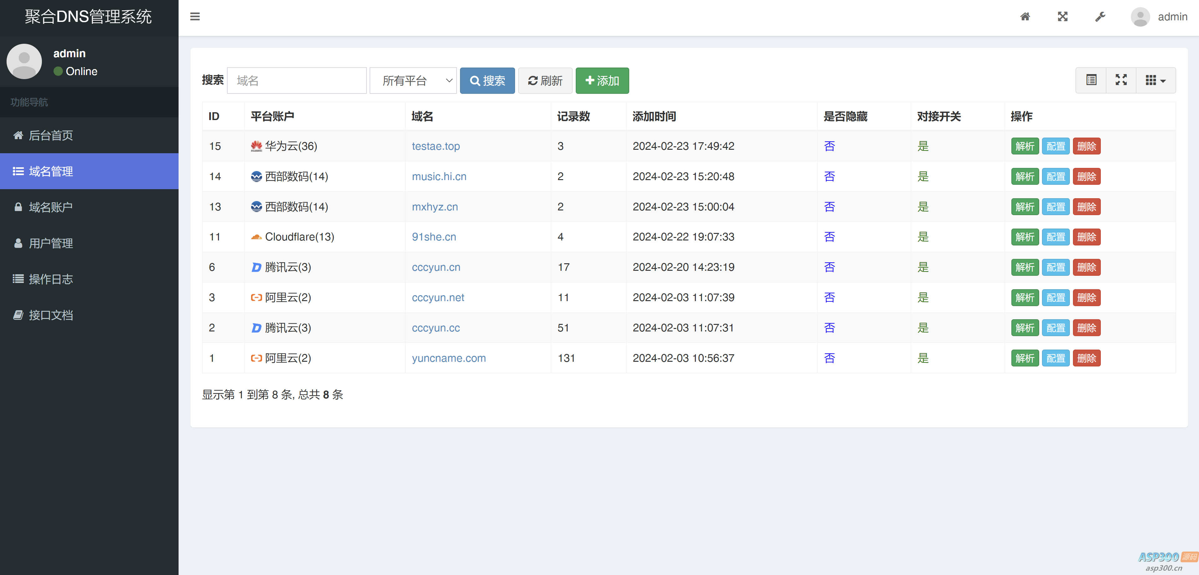 聚合DNS管理系统可以实现在一个网站内管理多个平台的域名解析,目前已支持的域名平台有:阿里云、腾讯云、华为云、西部数码、CloudFlare。本系统支持多用户,每个用户可分配不同的域名解析权限;支持API接口,支持获取域名独立DNS控制面板登录链接,方便各种IDC系统对接。 部署方法: