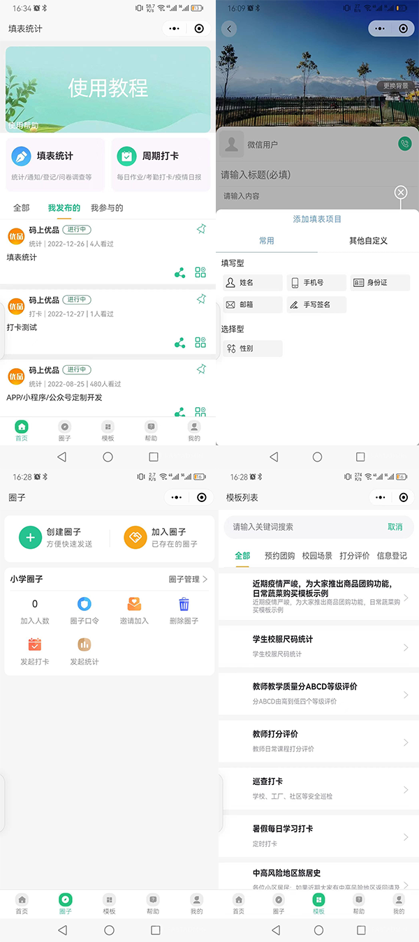 圈子功能 :圆子功能适用于创建各类人际(同学圈、朋友圈、工作圈等等)可以只针对本圈子发布填表统计或者周期打卡;