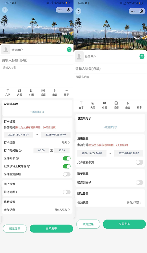 周期打卡:周期打卡功能适用于多次填报信息的场景:学生每日作业、职工每日考勤、设备定期巡检等;