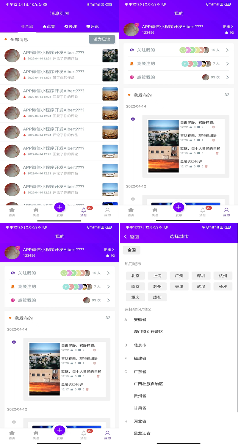 朋友圈动态;关注的人列表按照时间顺序显示发布的Z新动态,类似朋友圈效果。