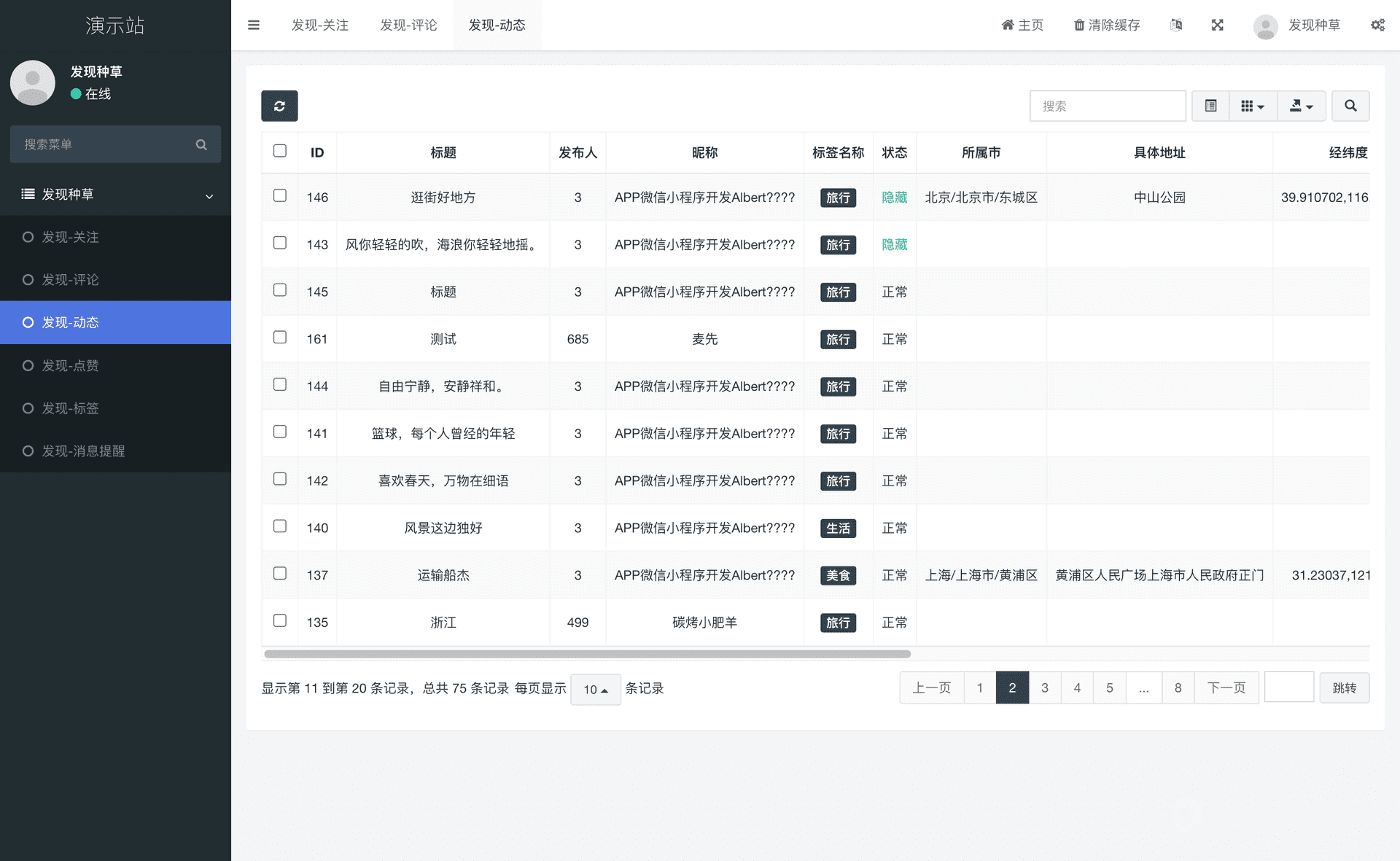 自助发布;用户端可以再手机端直接发不动态,包括动态图片,介绍,位置信息等。