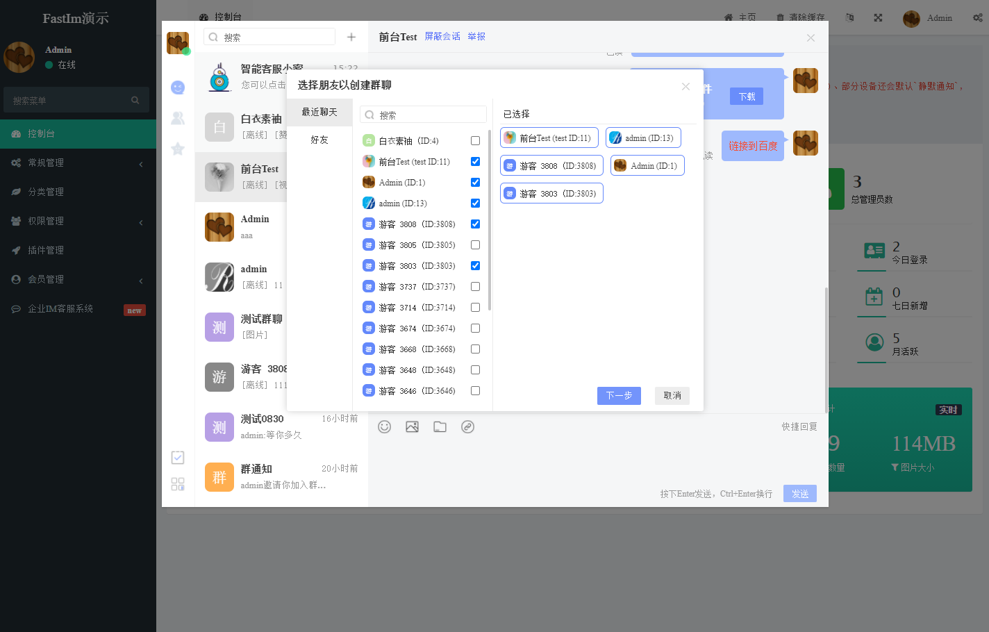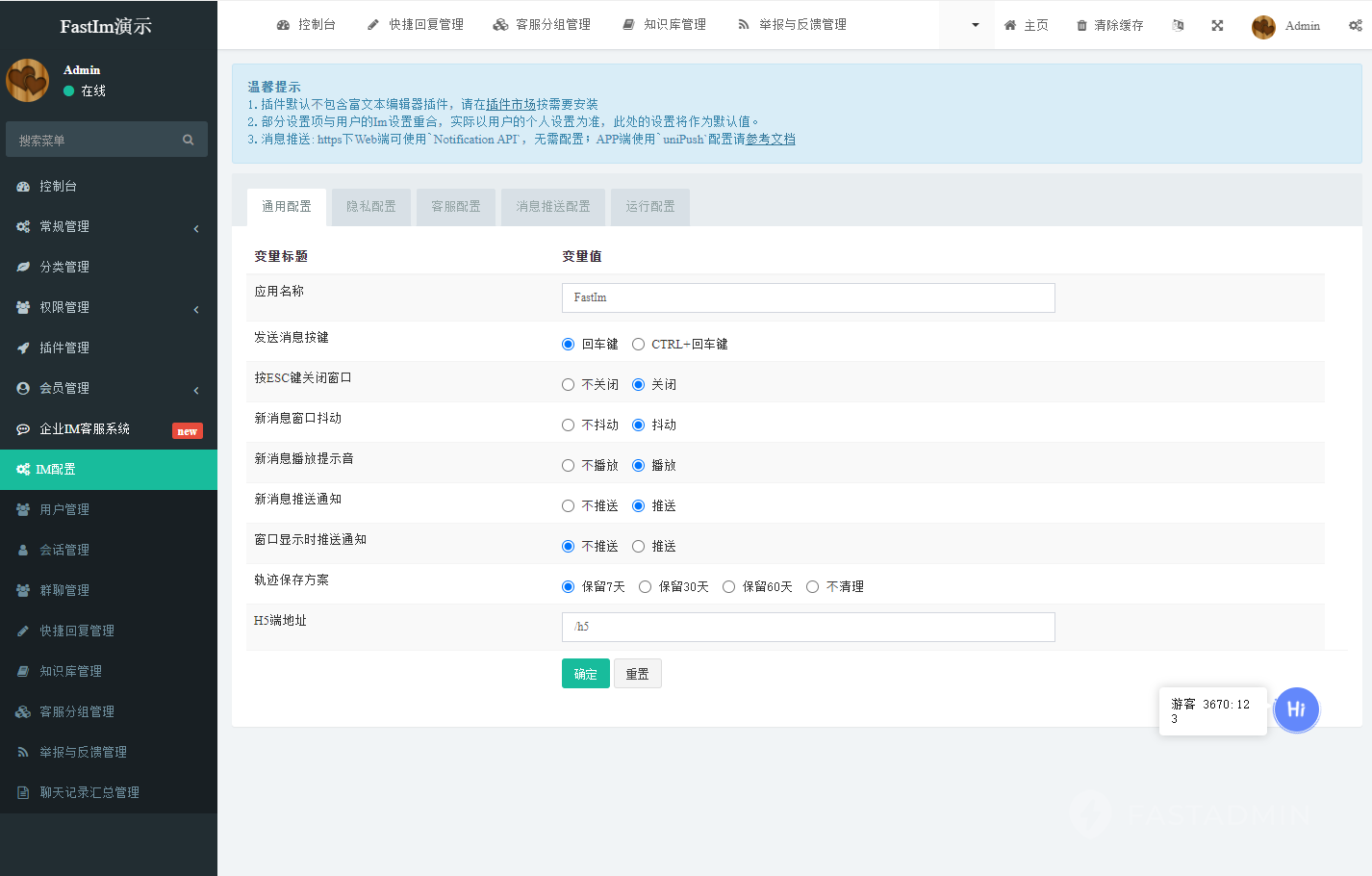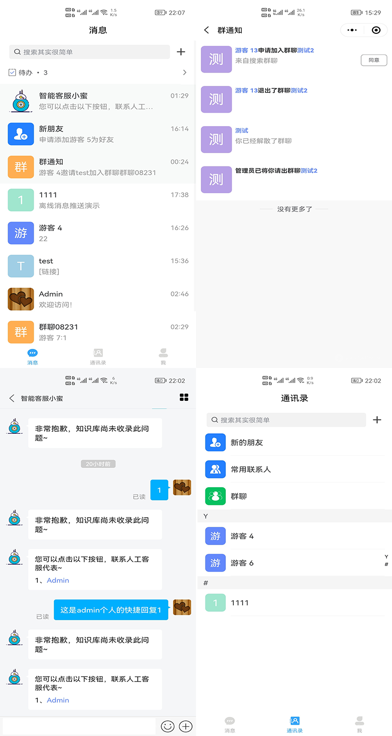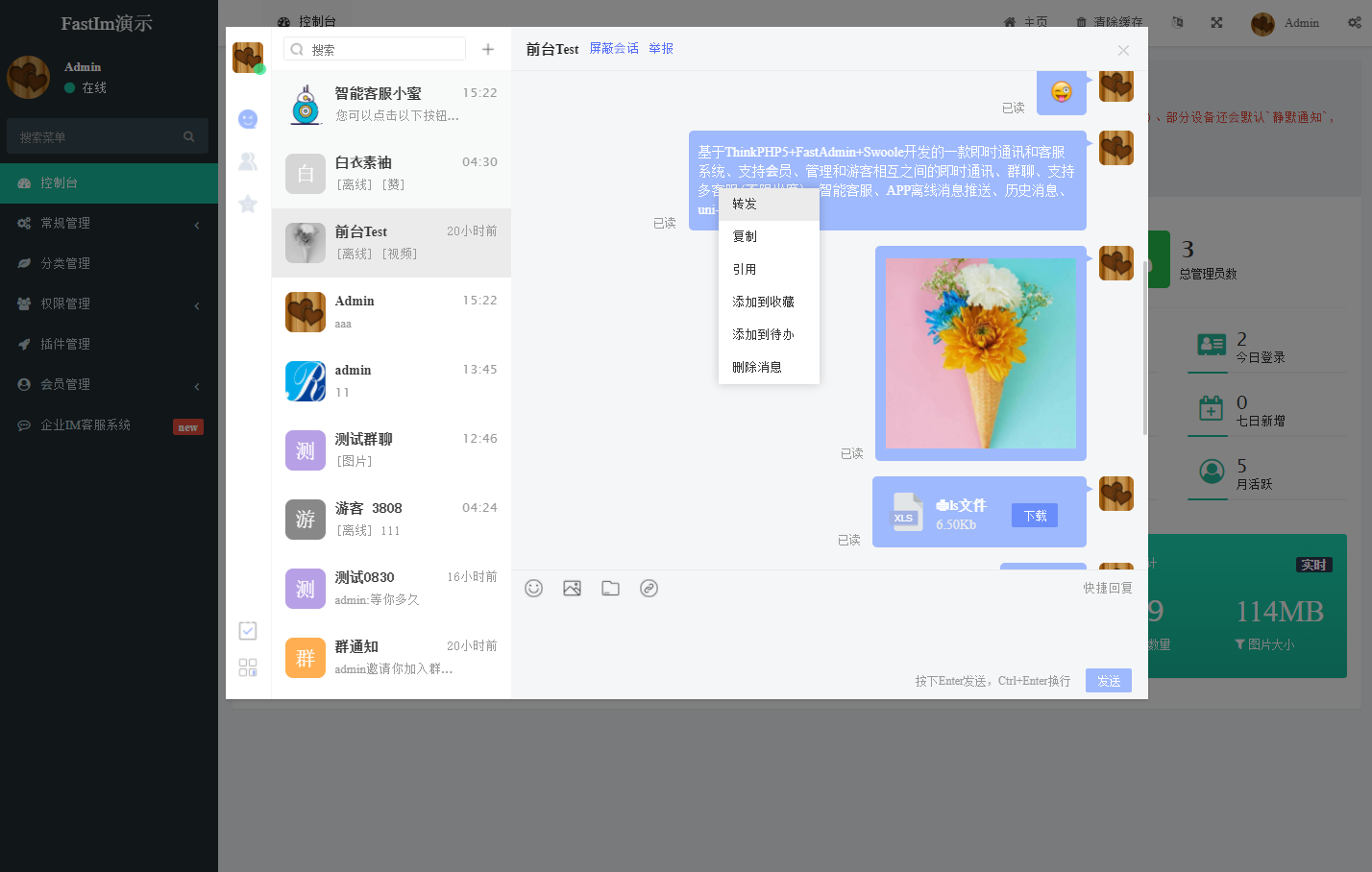 基于ThinkPHP5+FastAdmin+Swoole开发的一款即时通讯和客服系统、支持会员、管理和游客相互之间的即时通讯、群聊、支持多客服(不限坐席)、智能客服、APP离线消息推送、历史消息、uni-app接入。 提供全部无加密服务端源码和前端源代码,独立部署,不受限制。