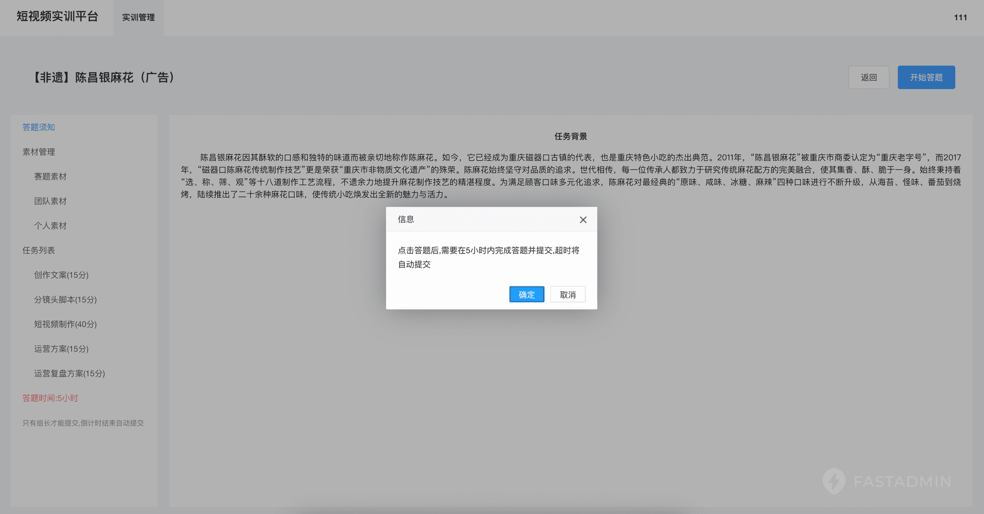 一款基于FastAdmin+ThinkPHP开发的一款短视频实训平台系统,该系统可满足拥有短视频类课程的职业院校、校外培训机构等团队使用。可进行“全国职业院校技能大赛”中“短视频创作与运营”相关赛程的模拟,以及院校日常的短视频课程的实训使用。同时可方便进行短视频实训的各类素材管理、实训素材分发、学生下载素材等。拥有管理员、教师、学生等多种身份权限。
