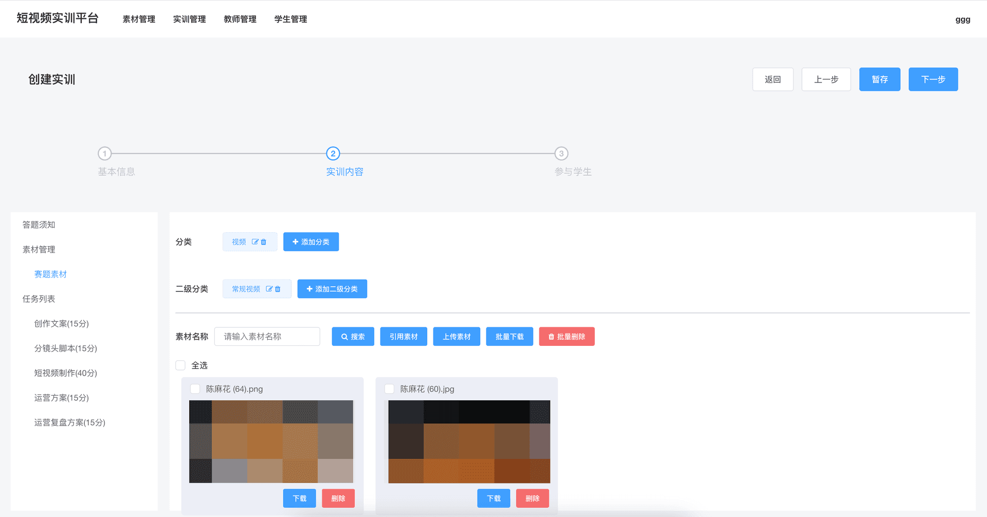 素材引用:创建实训时,实训素材支持直接引用素材库,也同时支持直接上传素材。