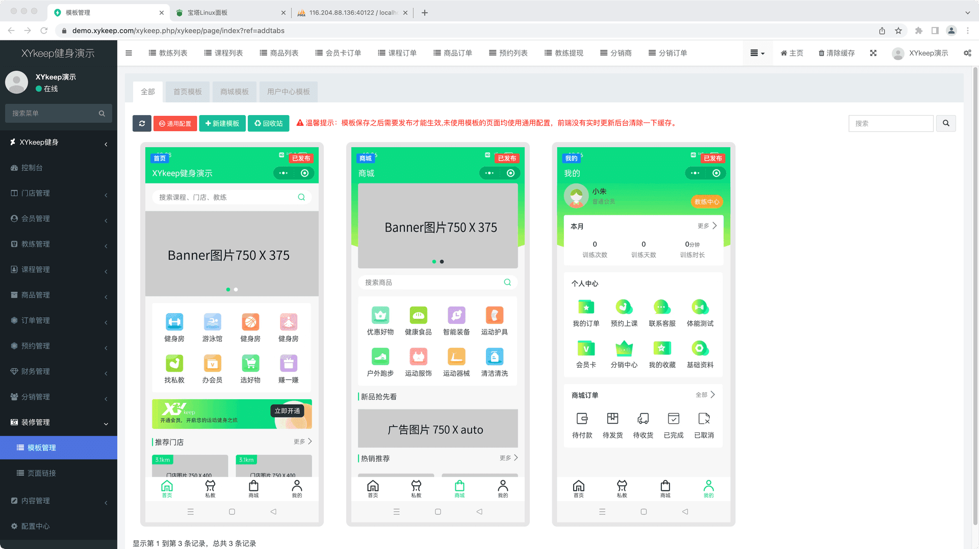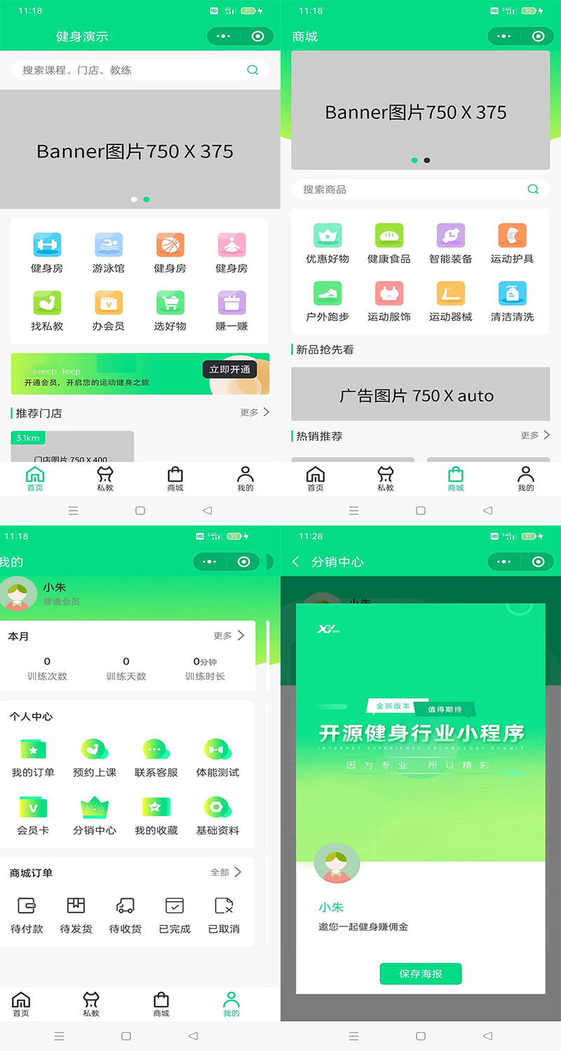 基于ThinkPHP+UniApp(目前仅支持微信小程序和公众号)开发的健身相关行业微信小程序,程序适用于健身房、瑜伽馆、游泳馆、篮球馆等健身培训场所。平台拥有课程售卖、课程预约、多门店管理、私教预约、教练端、会员卡办理、在线商城、分销模块、页面自定义装修等功能,为健身场馆提供智慧型运营解决方案,平台简单便捷,能有效提升场馆办公效率。