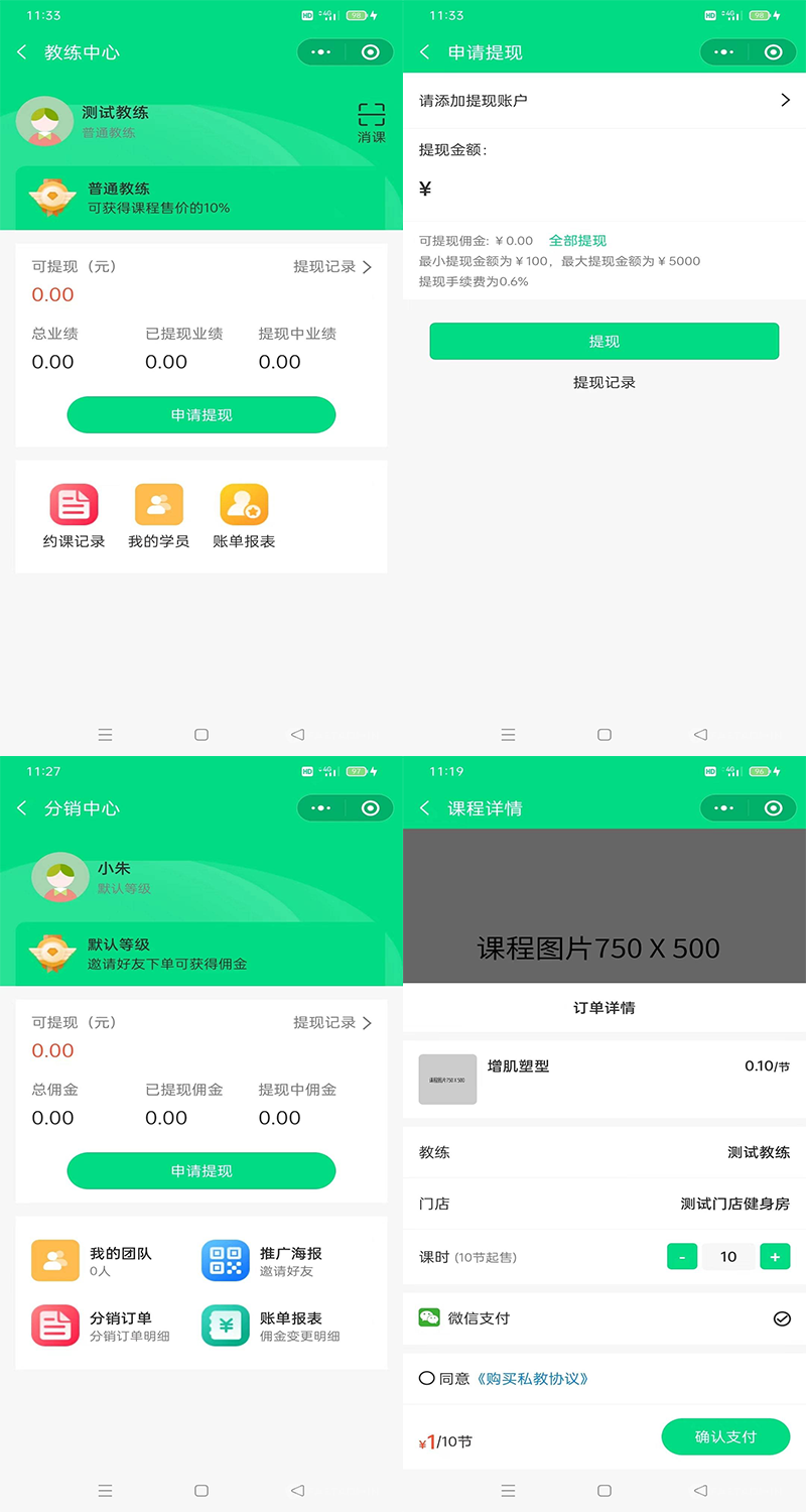 财务模块:后台可处理教练和分销商提现。