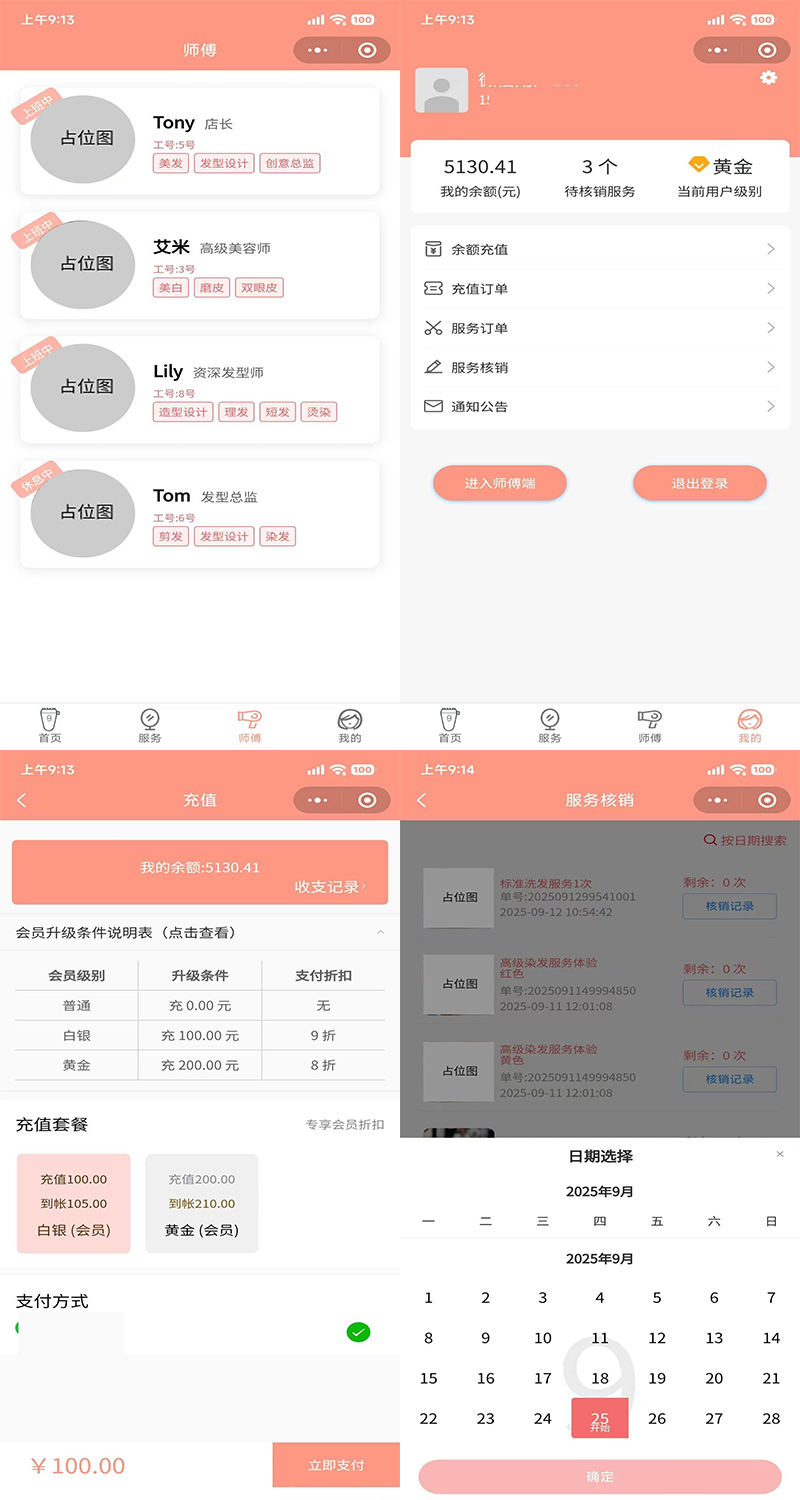 师傅管理:师傅手机号来判断登陆师傅管理中心,师傅可以在小程序内进行核销服务,可设置上下班。显示自己的累积服务次数。:核销服务