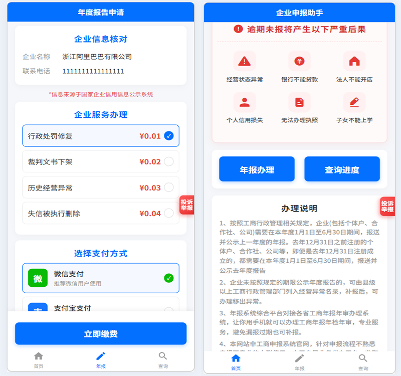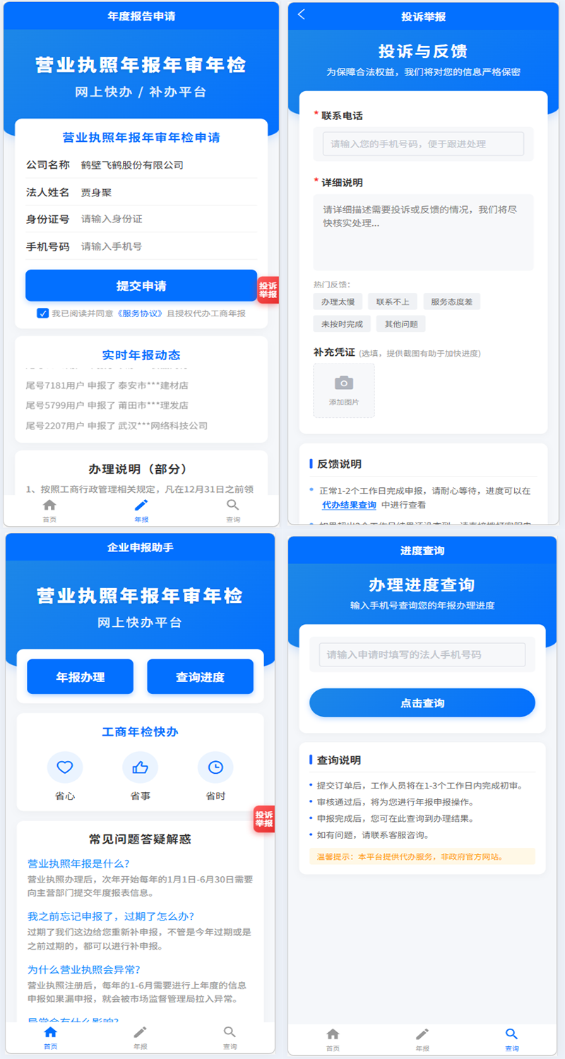 本系统提供便捷的工商年度报告申报服务,帮助企业高效完成年度工商信息申报工作。系统采用先进的数据加密技术,确保企业敏感信息安全,为企业提供专业、便捷、安全的一站式年报服务。