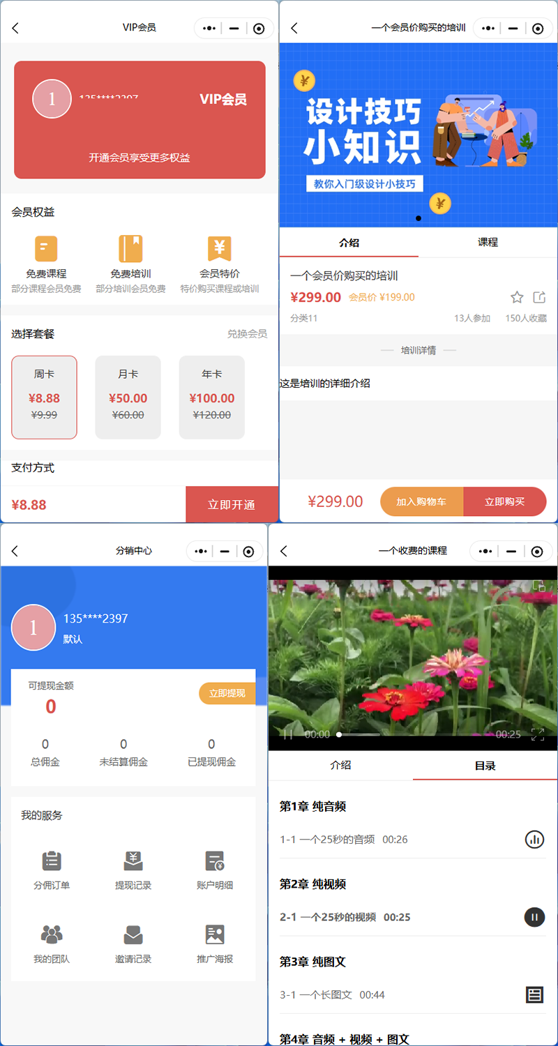 试播功能:视频和音频课程都支持试播放指定时长,让用户可以先行了解课程内容