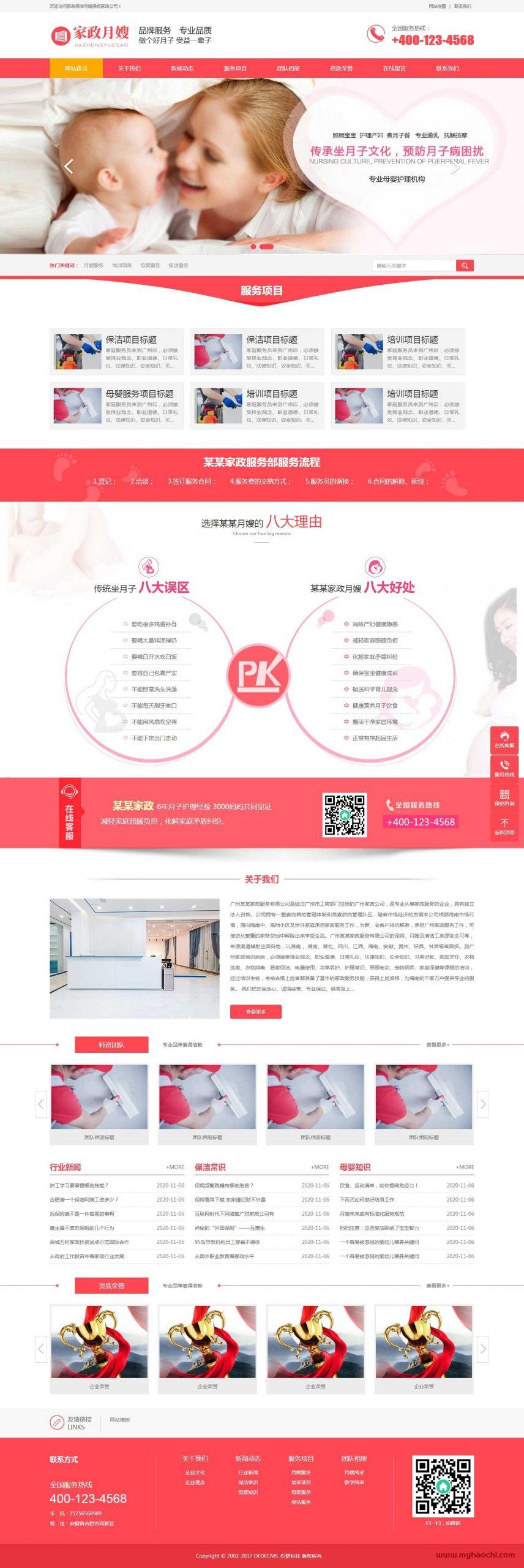 营销型家政保洁月嫂保姆家政公司网站织梦模板,粉色搭配黄色设计,PC站URL静态化快速提高收录和关键词排名。