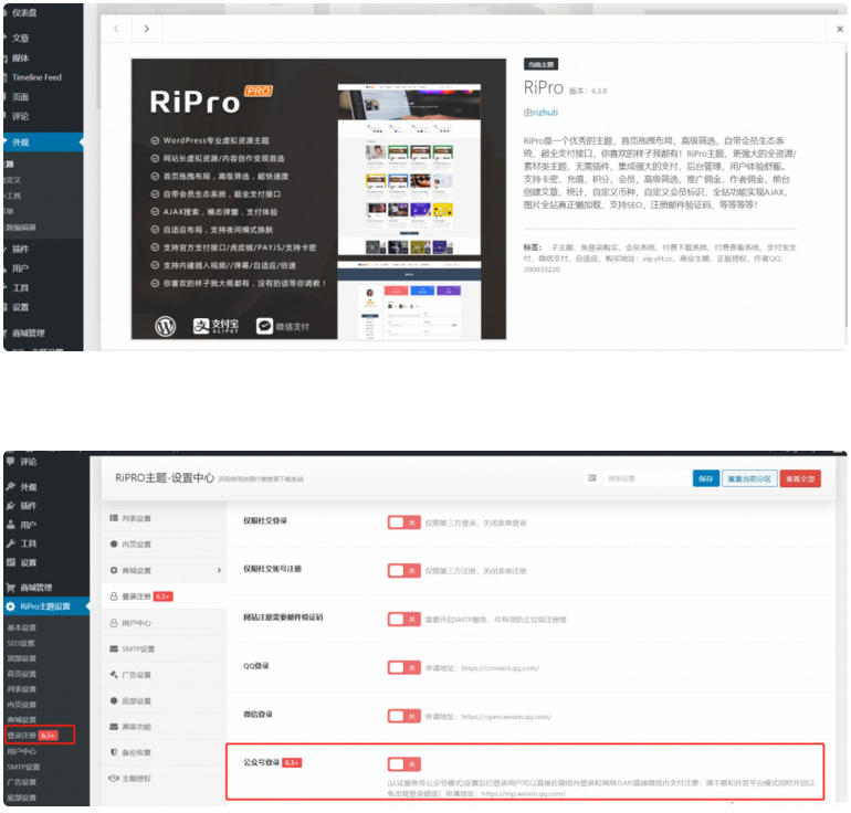 新增微信公众号登录-主题设置-登录注册-公众号登录6.3+,具体配置教程在ripro演示站有文章