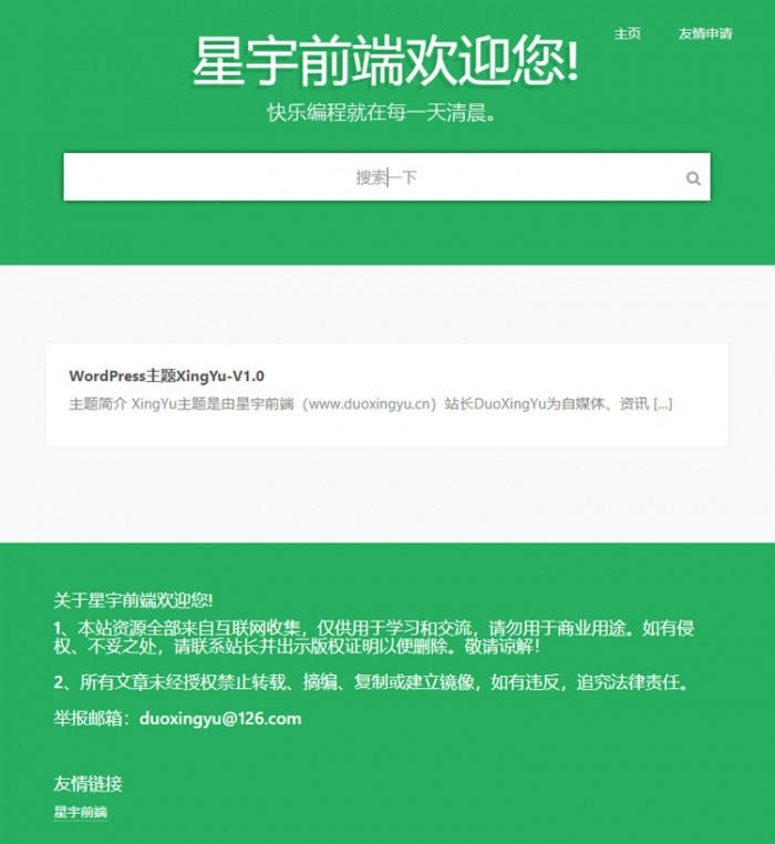 XingYu主题是由星宇前端站长DuoXingYu为自媒体、资讯类WordPress程序网站开发的自适应移动跨平台设备的Wordpress模板,适合自媒体、个人软件下载站等个人品牌资讯类型站点。