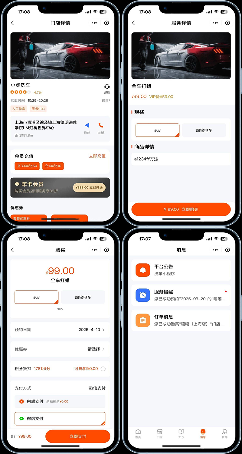 6、在线预约:用户现在预约服务,可微信支付或使用套餐卡抵扣