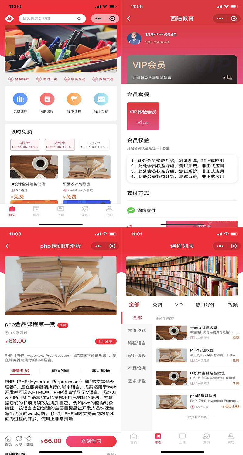 一款基于ThinkPHP+Uniapp开发的教育系统(微信小程序、H5网页),支持线上线下课程报名,线上课程支持视频课程、音频课程、图文课程、课程在线支付。