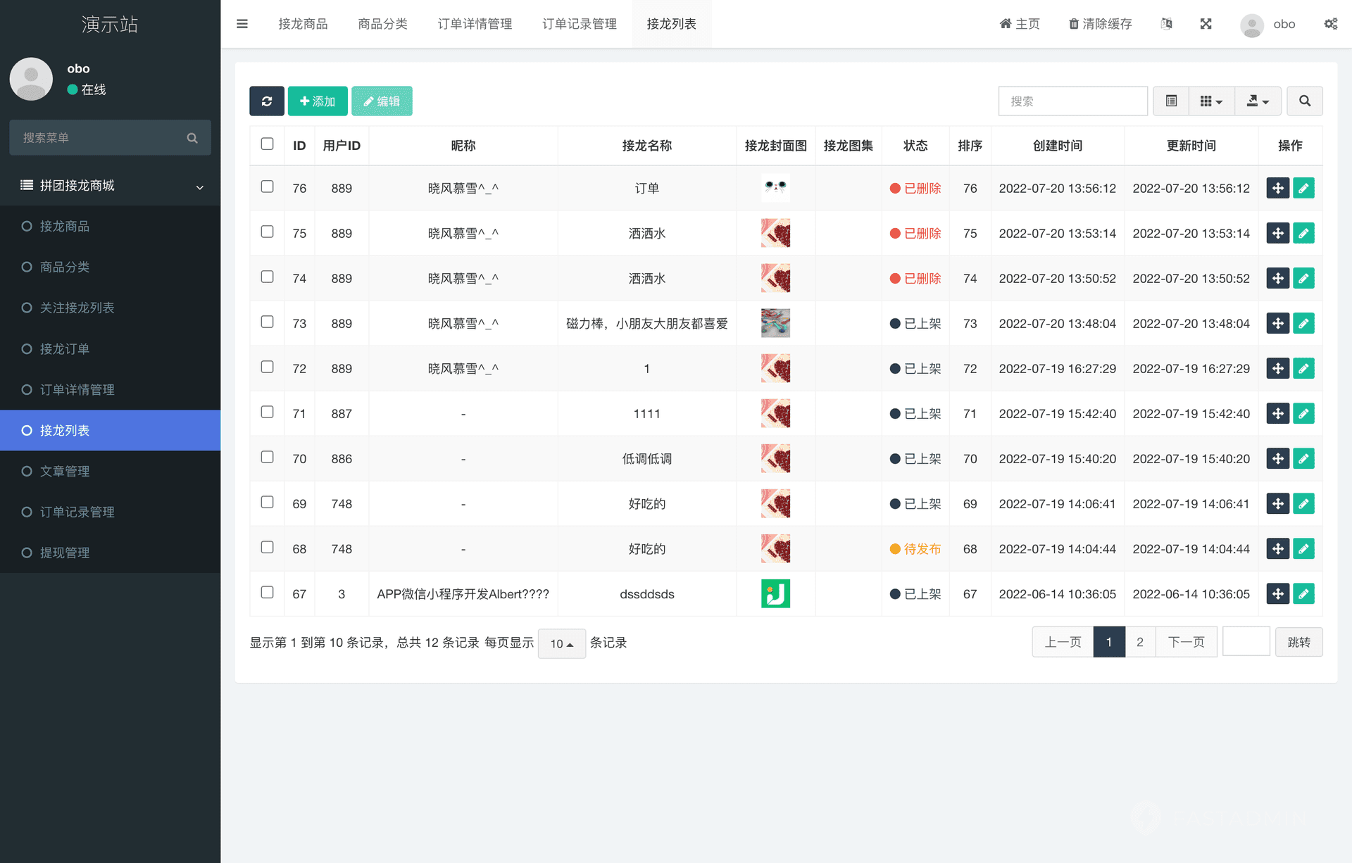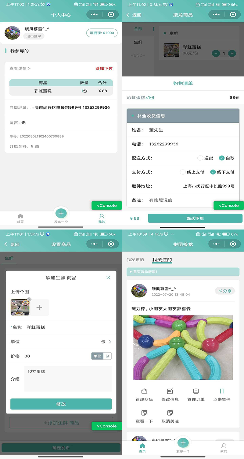 订单管理:用户端可以管理自己参与的接龙或者发布的接龙订单数据