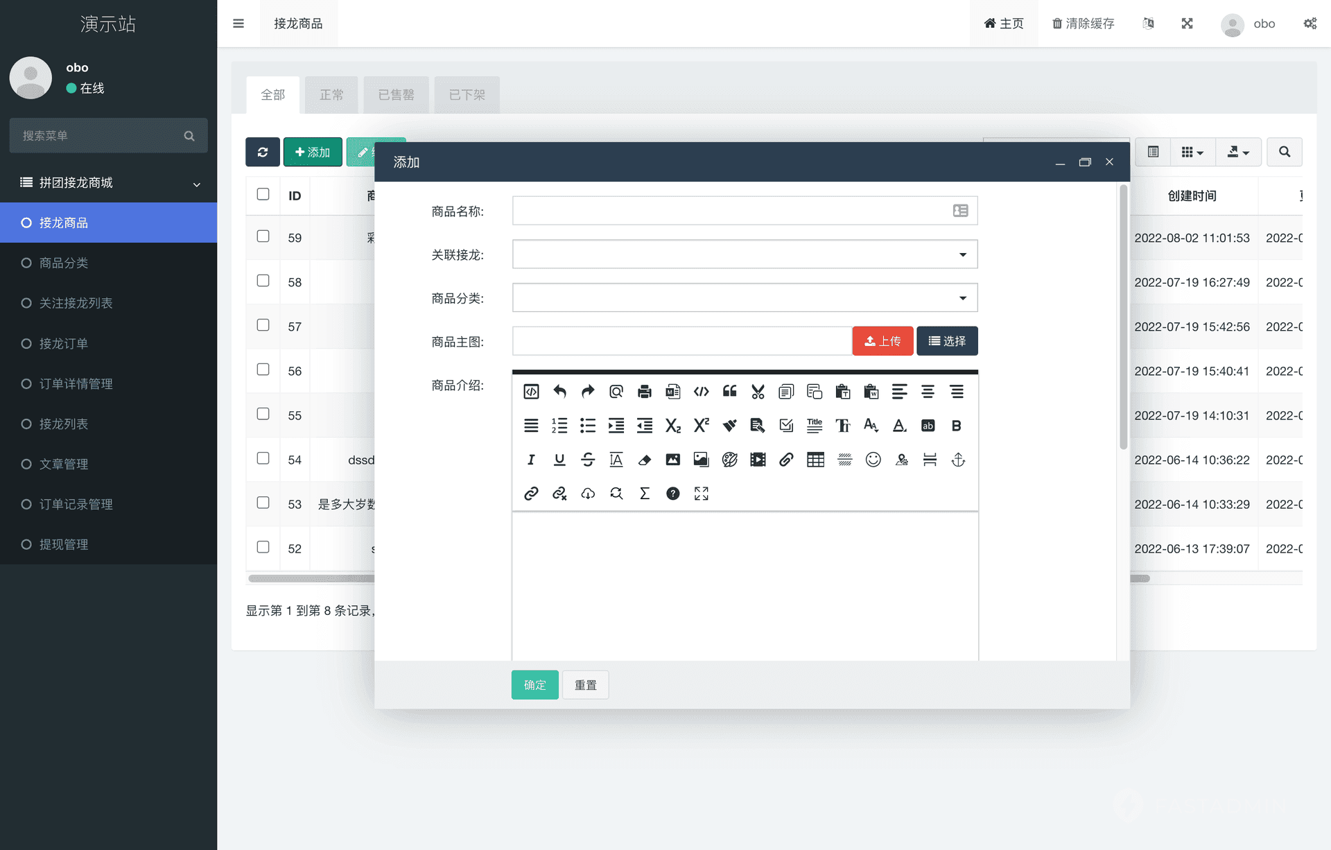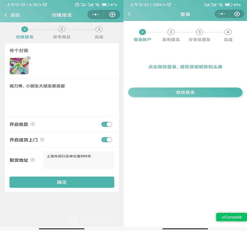 自定义发布商品:创建接龙,即可上传商品,包括商品名称,介绍,定价等数据