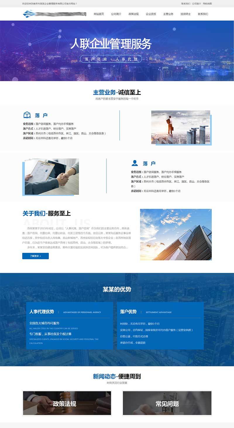 蓝色的人联企业管理服务公司官方网站模板html下载,包含:首页、公司简介、联系我们、荣誉资质、招贤纳士、服务范围、联系我们7个页面。